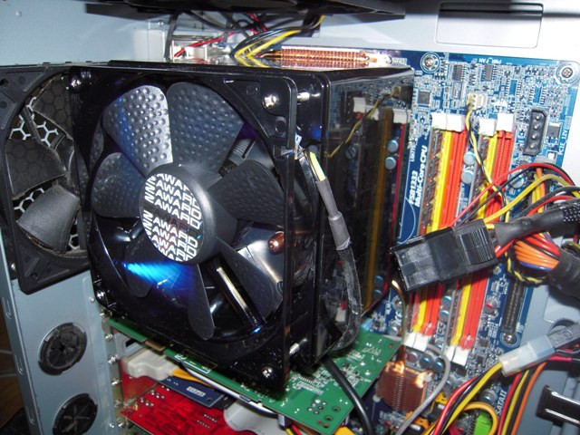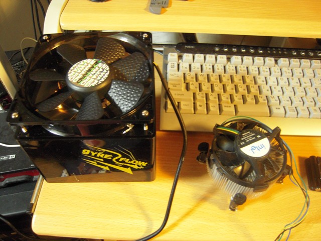 クーラーが箱に収められているので、自分の使っているAntec P180だとファンの目の前にでかい壁が…。